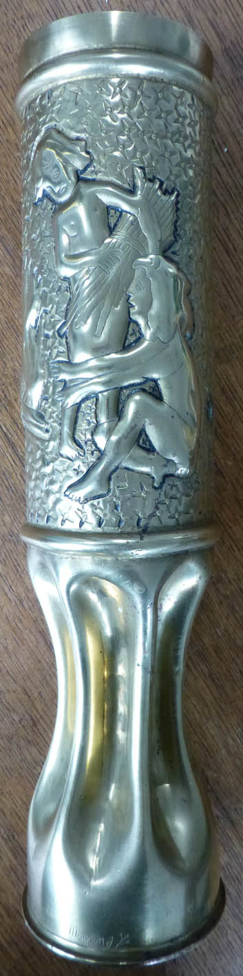 Sculpted and embossed shell with image of two cherubs (?) by a